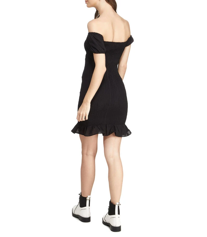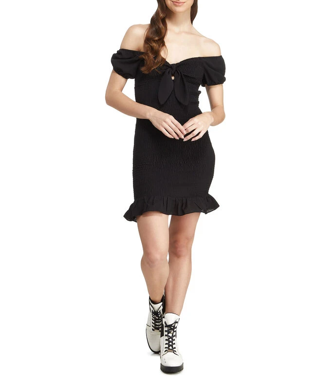 Vestido Catamaran medio de corte recto en tejido de punto, cuello cuadrado con detalle de nudo al frente, manga corta con bordes elásticos, frunce en cuerpo de la prenda y olán en bajo.