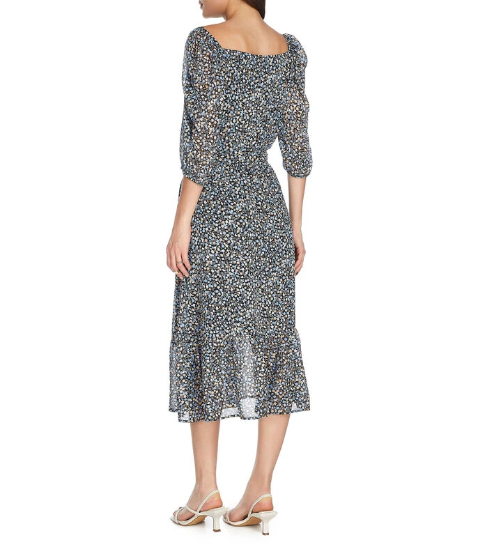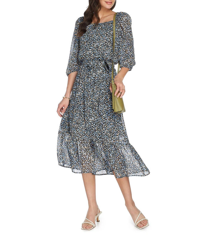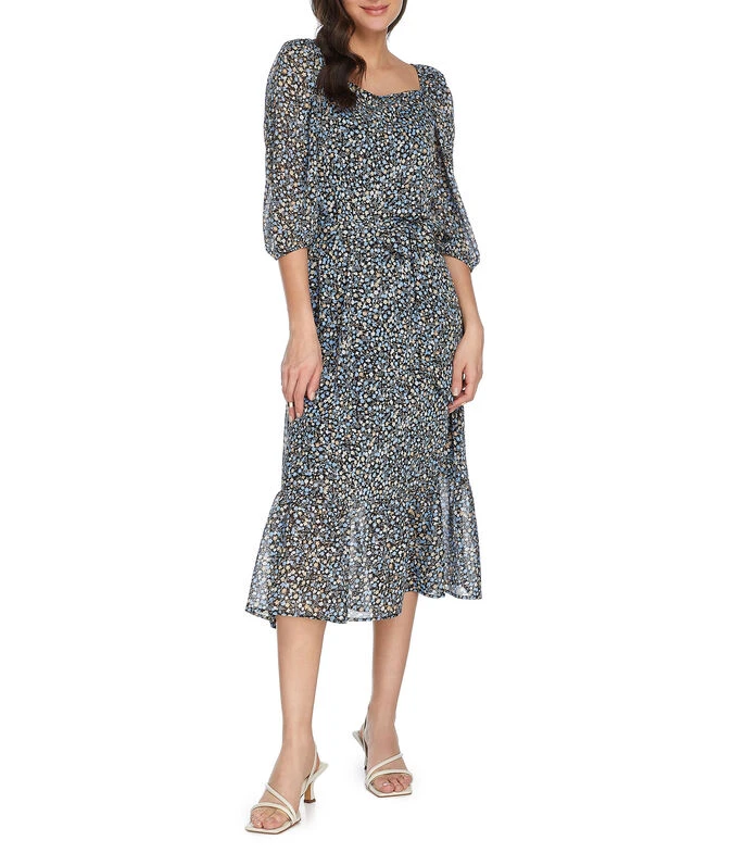 Vestido Pertegaz de corte A en tejido de punto, cuello cuadrado, manga 3/4, elástico en cintura y cinta para anudar.