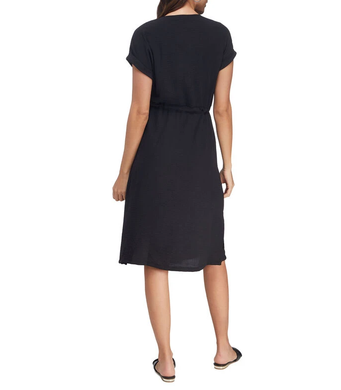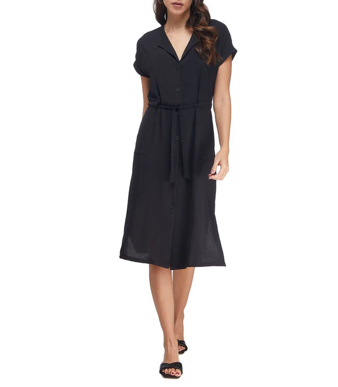 Vestido Paz Torras midi de corte A en tejido de punto, cuello V, sin mangas, botonadura a tono al frente y cinta ajustable en cintura.
