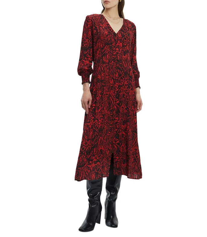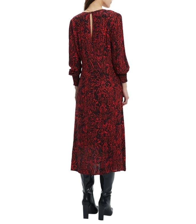 Vestido Andam midi de corte recto en tejido de punto con estampado fantasía, cuello V, manga larga, abertura en espalda y cremallera invisible.