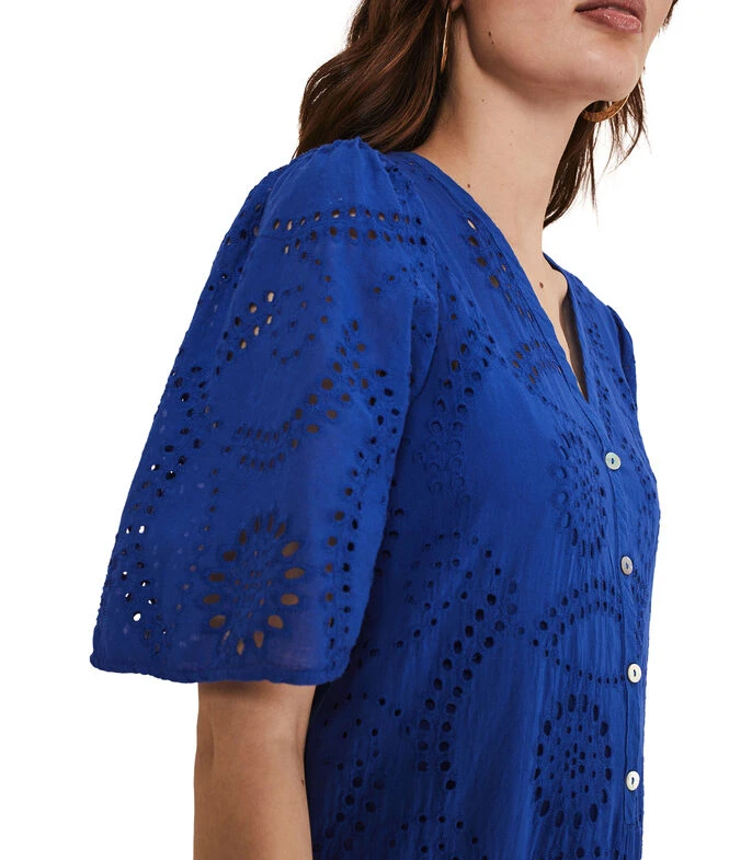 Vestido midi Phase Eight Meleri de corte recto en tejido de punto con original diseño calado, medio cierre de botones a contraste en parte frontal y volantes en falda. Lleno de detalles y encanto, este sencillo vestido midi será tu nuevo básico de verano.