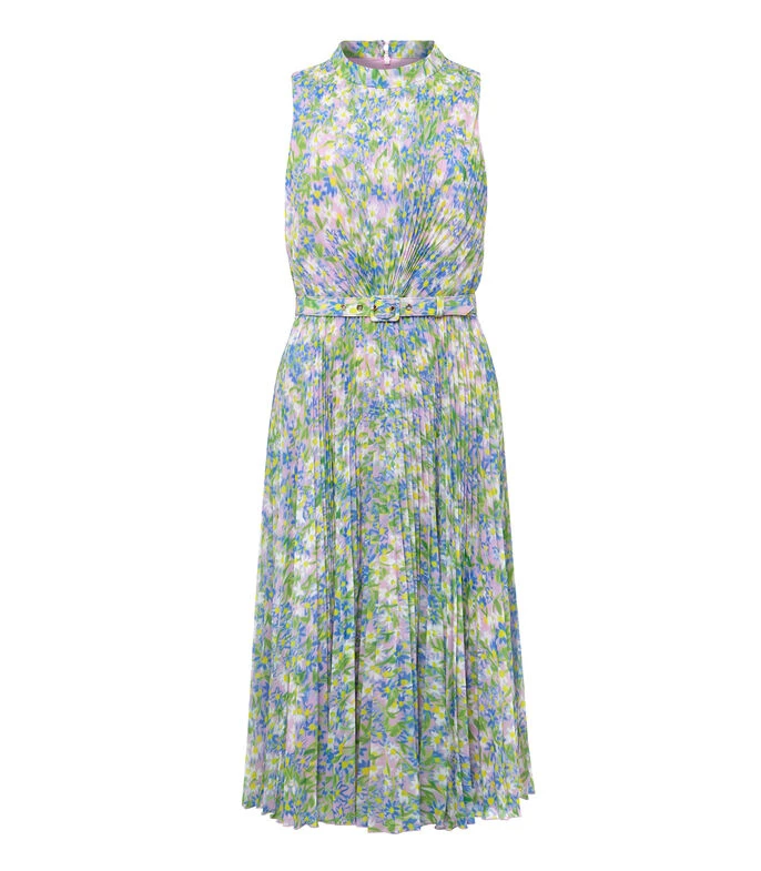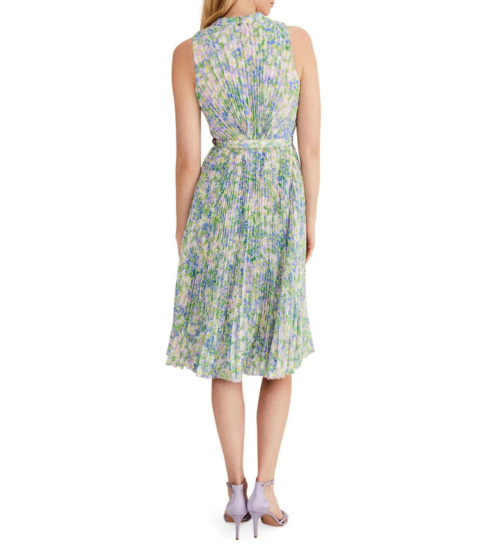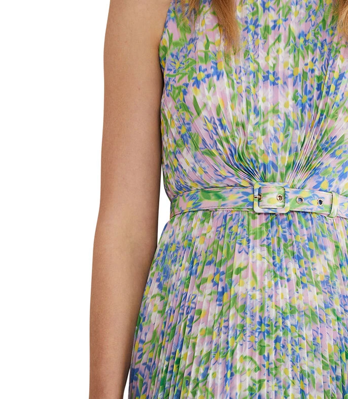 Vestido Phase Eight Simara Daisy midi de corte recto en tejido plano, diseño de suaves flores plisadas, cuello tipo halter, sin mangas, cinturón de ajuste en cintura, cierre de botón y cremallera en posterior. ¡Resalta tu figura y estilízalo con unos tacones, un bolso de mano a juego y prepárate para responder de dónde es, en tu próximo evento especial!