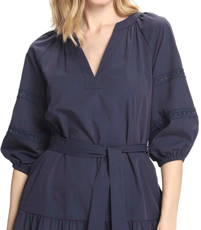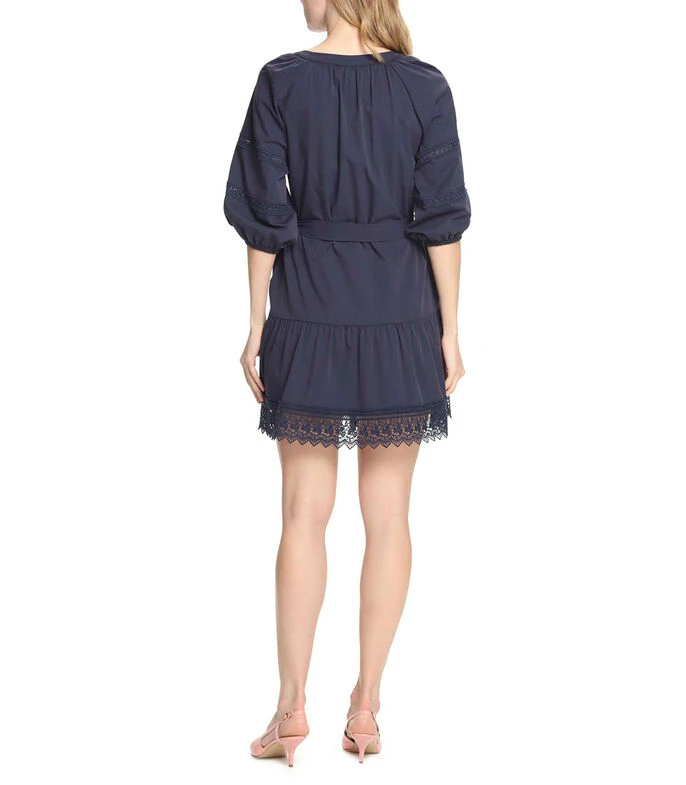 Vestido Julio mini de la Colección Cala en corte recto con tejido de punto liso, manga abullonada de 7/8, banda en la cintura, detalles calados y lazo ajustable en la cintura.