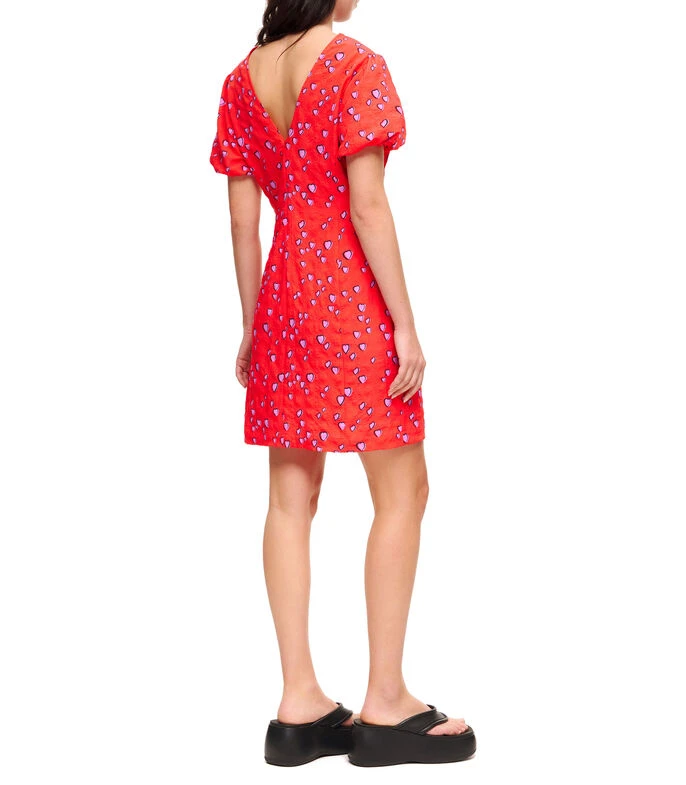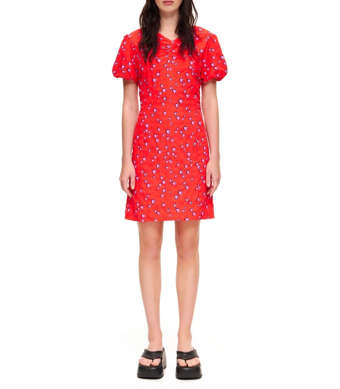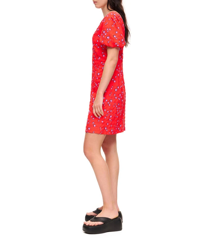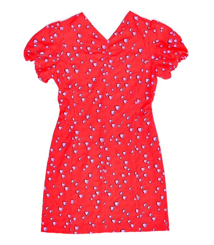 Vestido Bimba y Lola mini de corte recto en tejido de punto, detalle drapeado, manga corta abombada y escote sobre espalda. Un estampado de corazones multicolor le da a este hermoso vestido un toque romántico, para usarlo en cada ocasión.