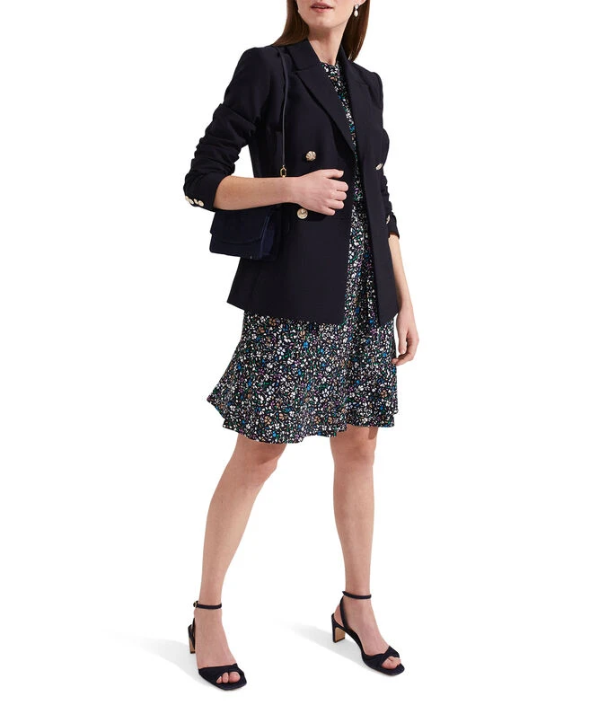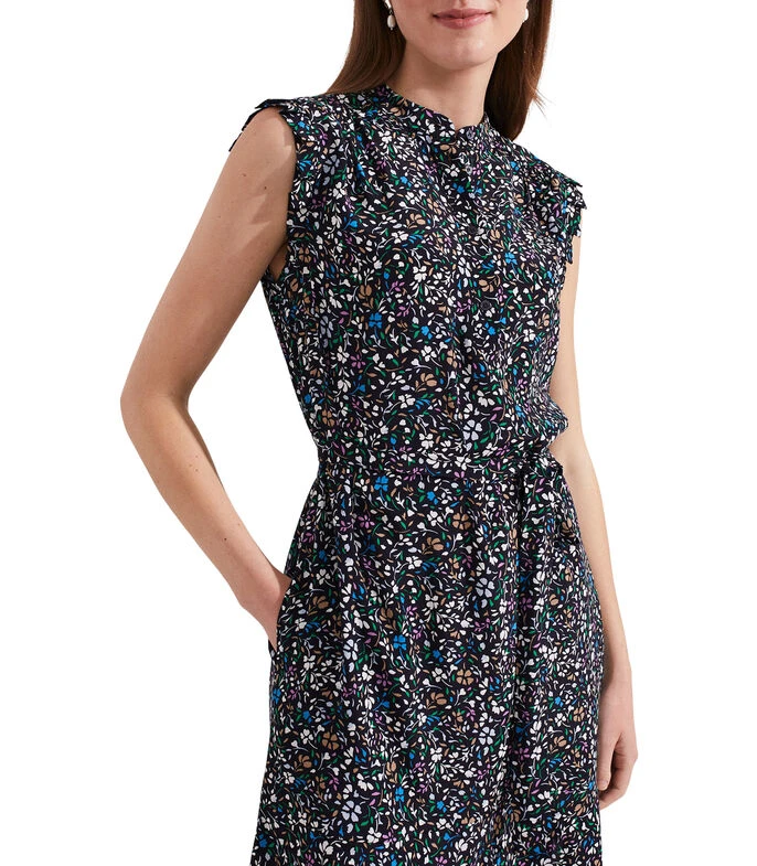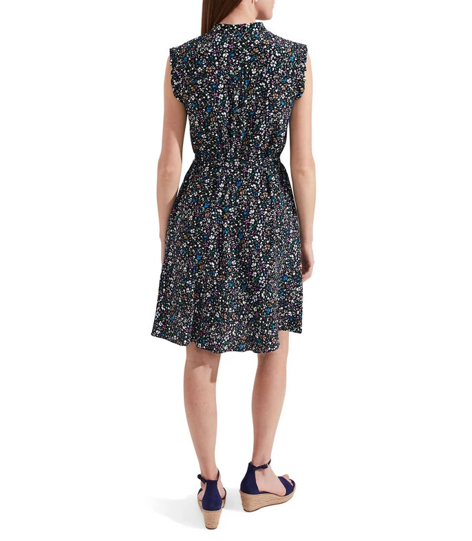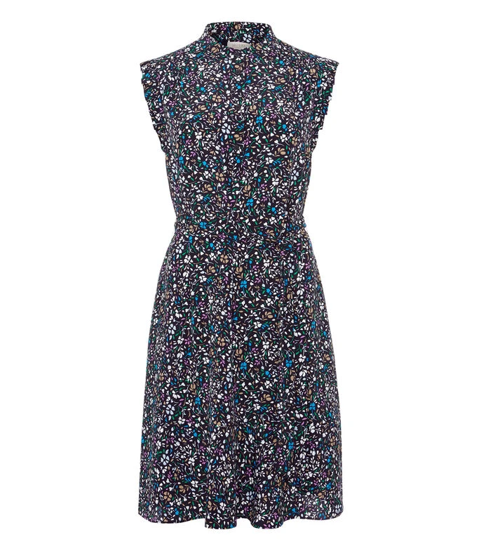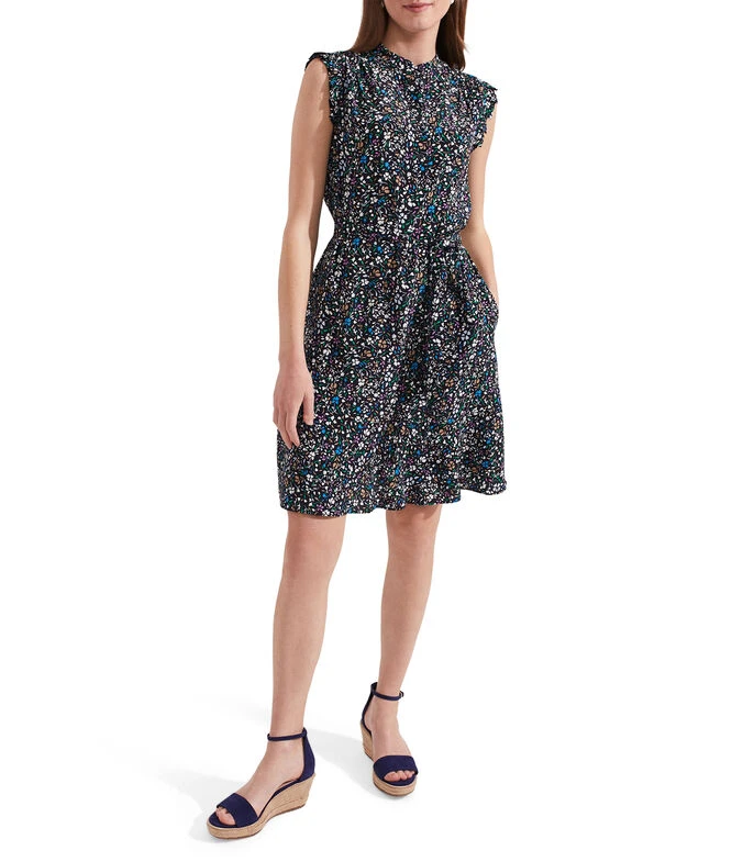 Vestido Hobbs Mini, de corte A en tejido de punto, cuello Mao, sin mangas, microdiseño a contraste, cinta para anudar y bolsillos en costados.