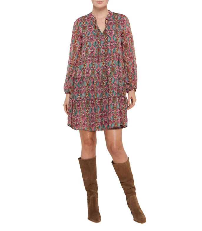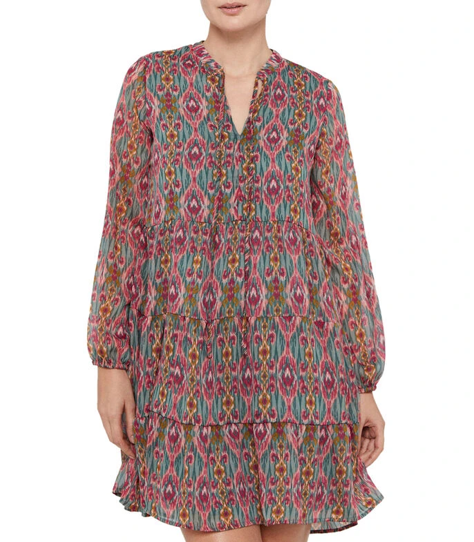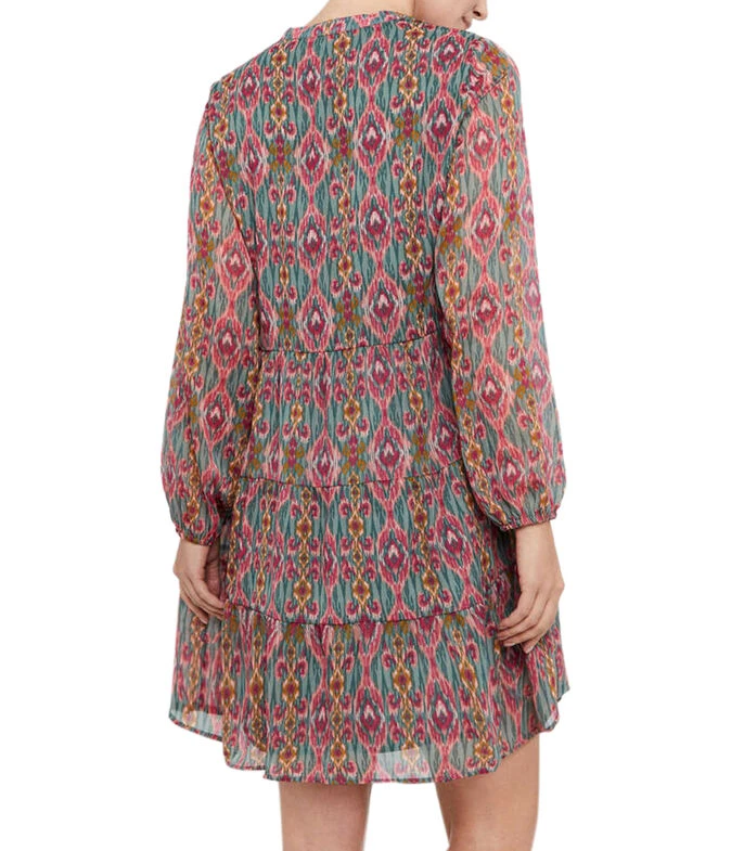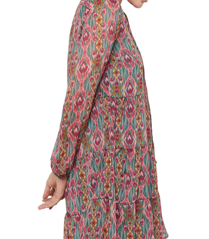 Vestido mini Cortefiel de corte evasé en tejido de punto con estampado paisley, manga abullonada y cintas para anudar en cuello.