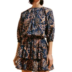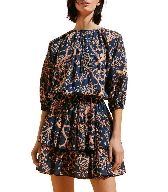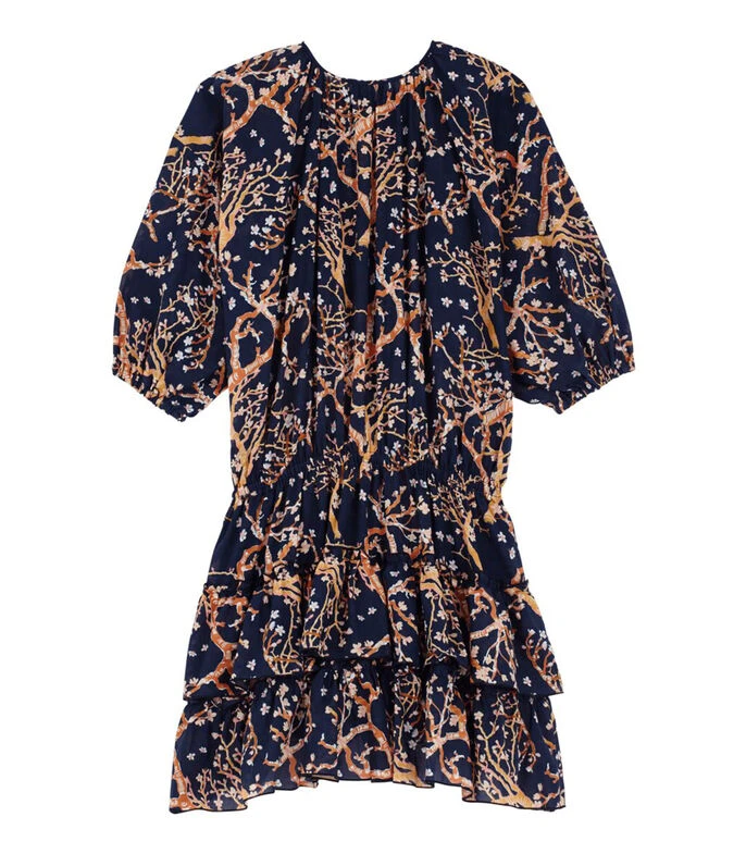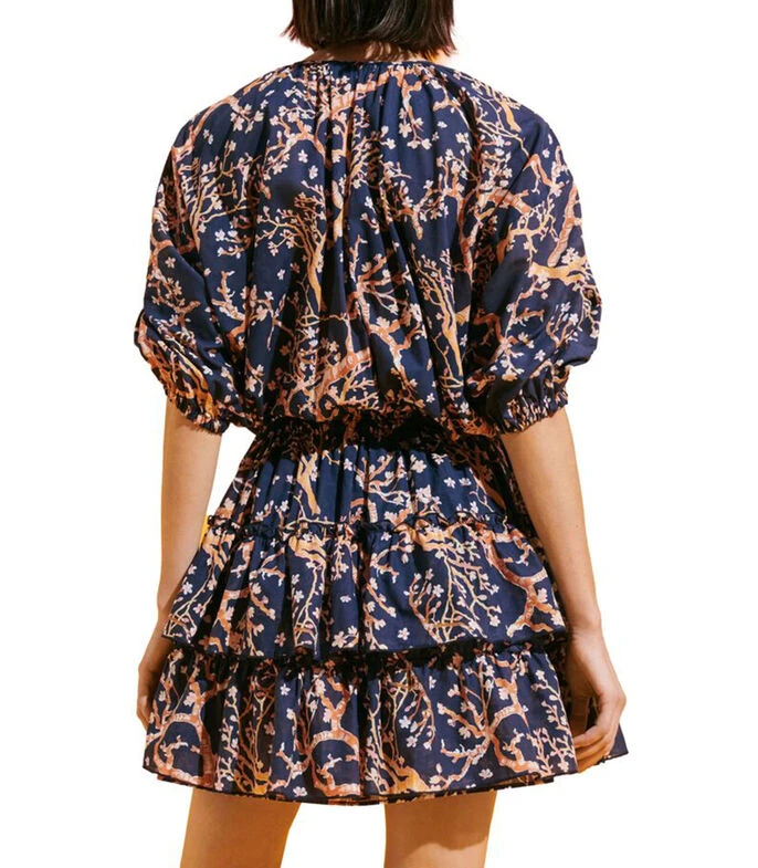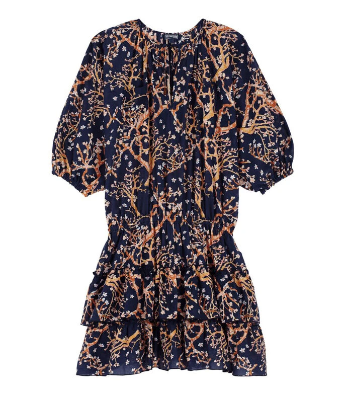 Vestido corto Vilebrequin de corte «A» en tejido de punto, elástico en cintura y holanes.