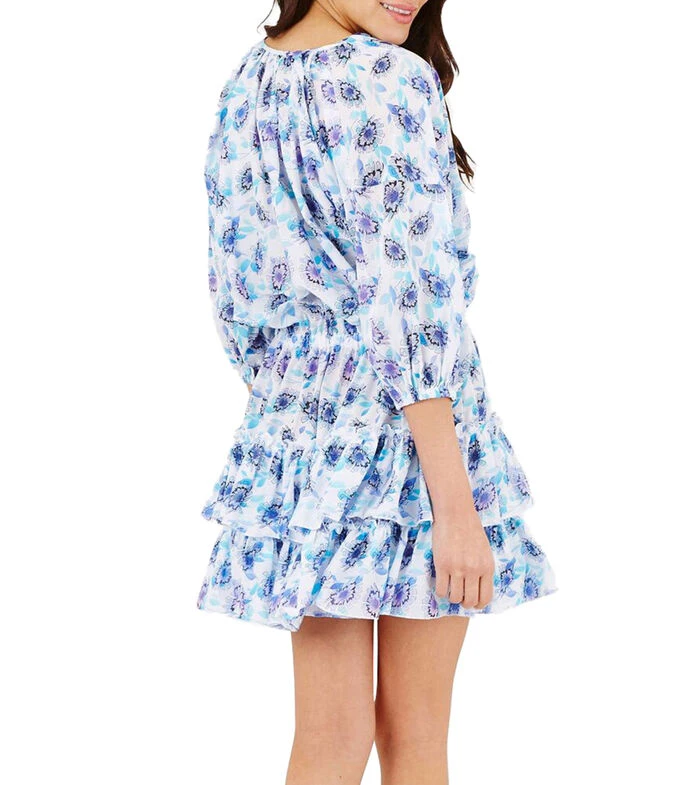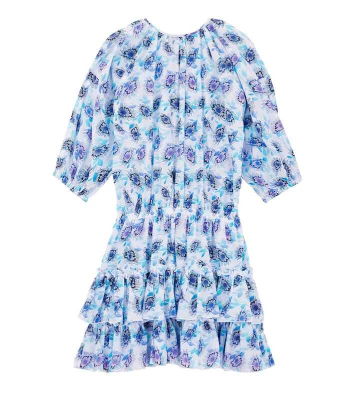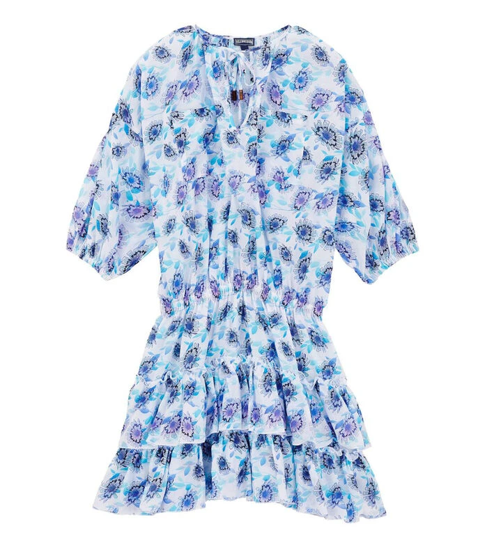 Vestido de playa Vilebrequin corto; de corte recto en tejido de punto con print Flash Flowers, cuello en V y aplicación de volantes en bajo.