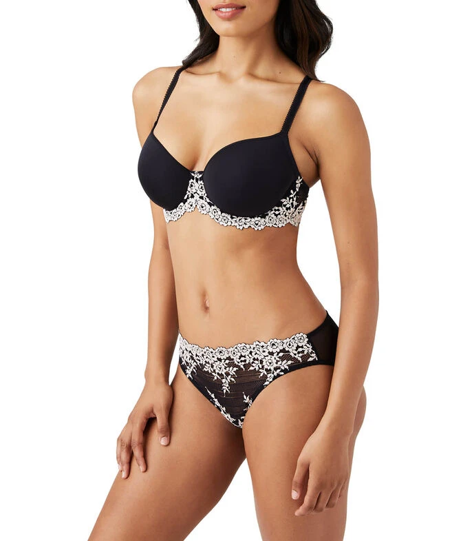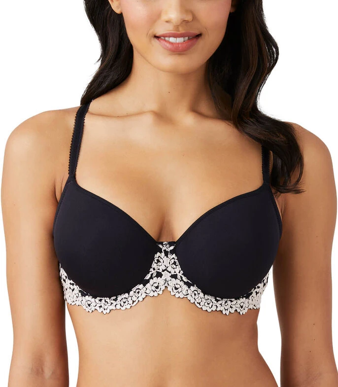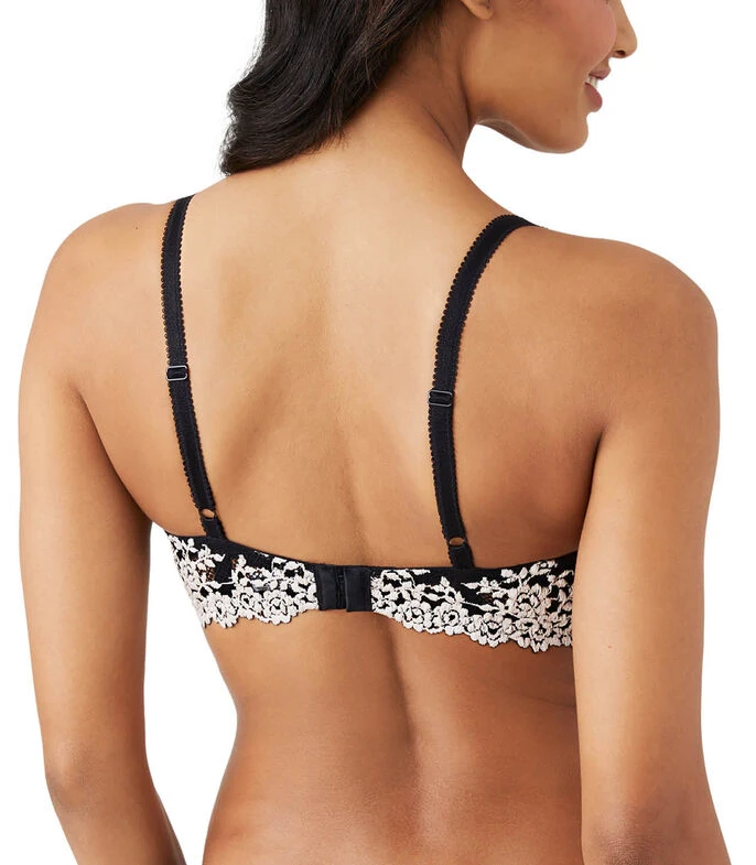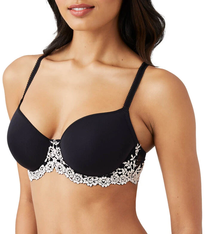 Brasier con varilla Wacoal Contour Embrace Lace; Las copas de espuma elástica proporcionan una silueta suave, especialmente debajo de las camisetas. Confeccionado con tirantes anchos y centro bajo para blusas con abertura o escotes, una hermosa banda central de encaje, correas totalmente ajustables y cierre por la espalda.