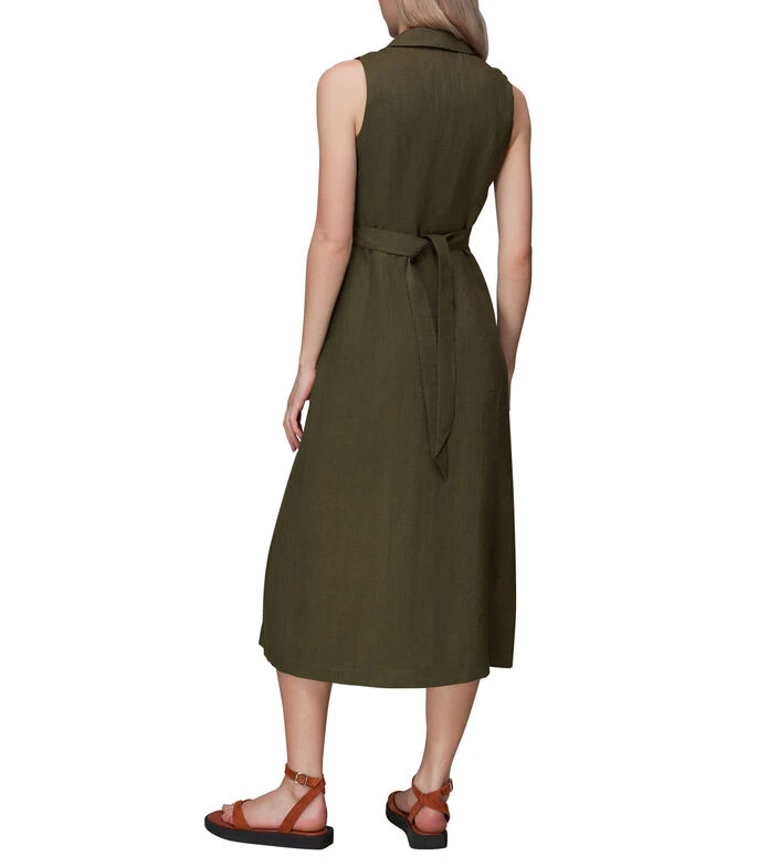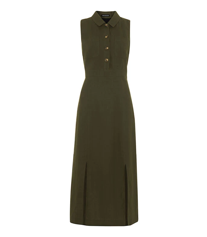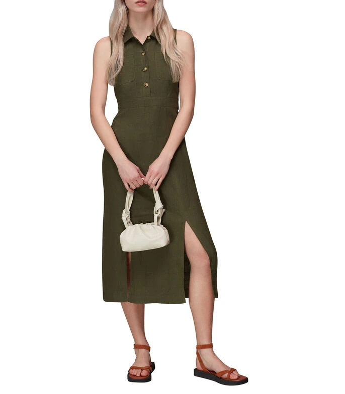 Vestido midi Whistles tipo camisero de corte ajustado en tejido de punto con bolsillos tipo parche, medio cierre de botones carey y aberturas en parte inferior.