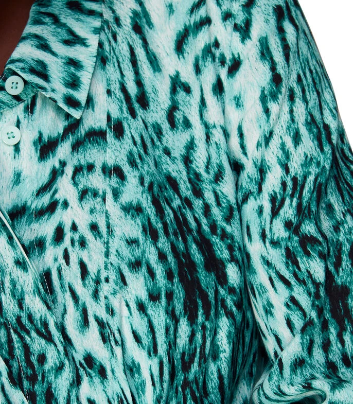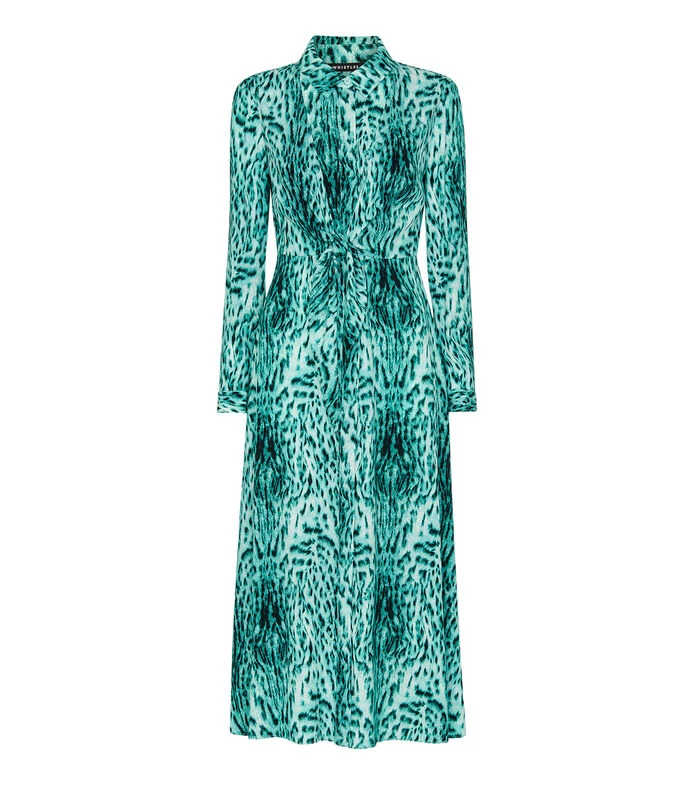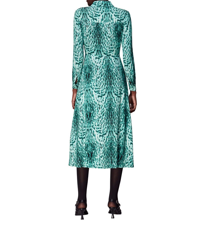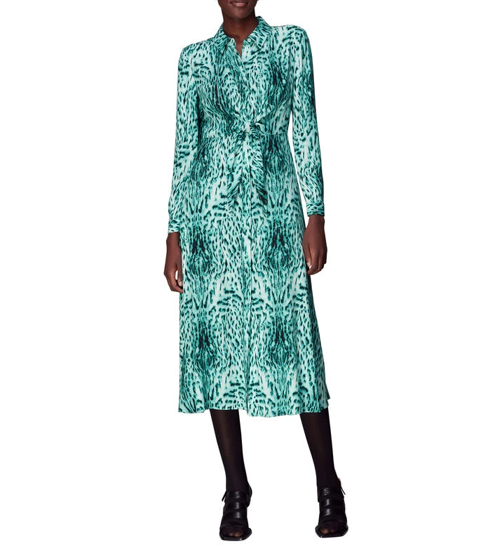 Vestido Whistles midi de corte recto en tejido de punto con animal print de leopardo, cuello camisero, manga larga y detalle fruncido al frente.