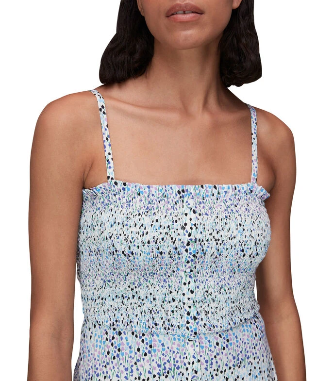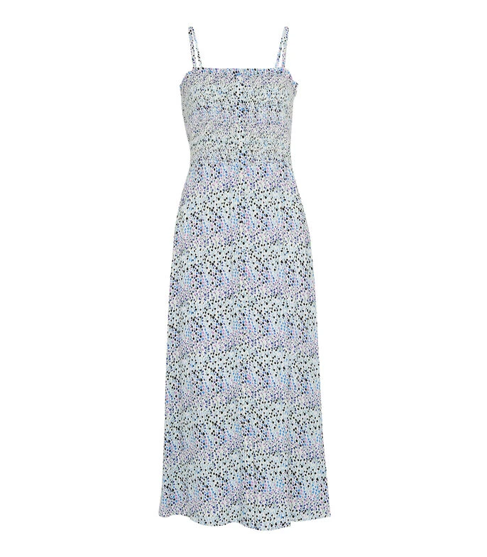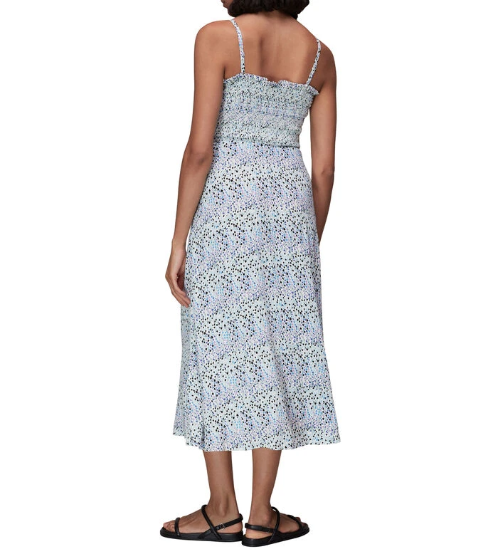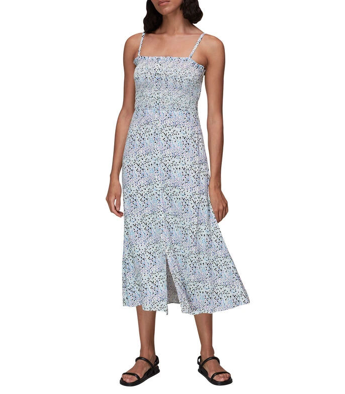 Vestido midi Whistles de corte recto en tejido de punto con estampado de lunares multicolor, tirantes delgados, detalles fruncidos en parte superior y cierre frontal de botones a tono.