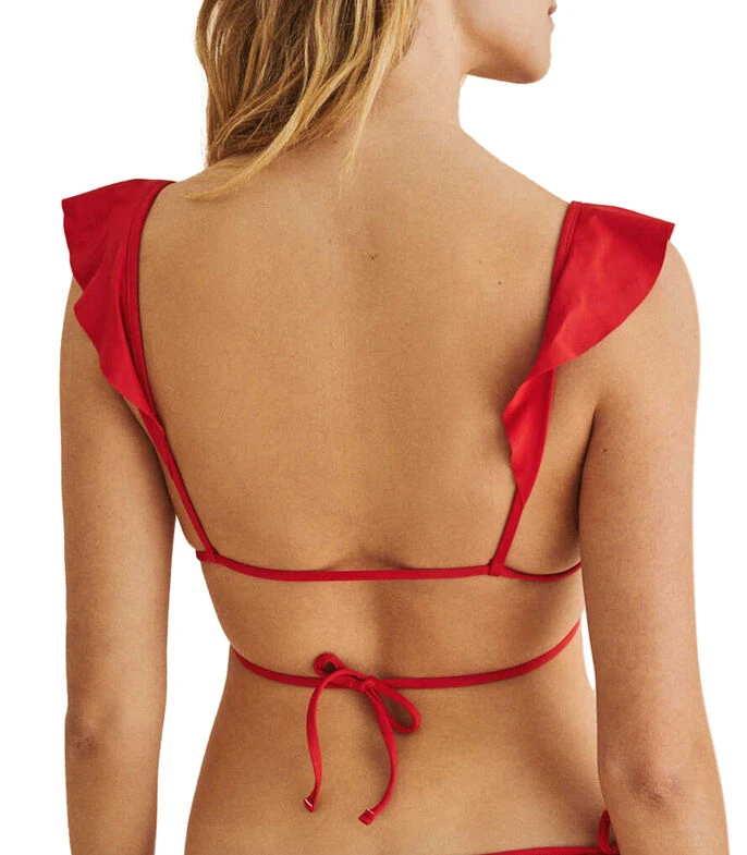 Bikini Top Women’Secret en tejido plano, cuello tipo Plunge, holanes al frente, cintas para anudar en cintura y espalda. Con detalle de volantes en la zona del pecho y tirantes, y copas extraíbles para que puedas llevarlo como más te guste. Por si fuera poco, este top de bikini pertenece a la colección HONEST debido a que está confeccionado con materiales reciclados, lo que hace que sea más sostenible.
