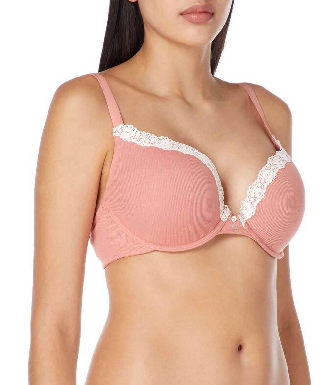 Brasier Women’Secret en tejido de punto con acabado canalé, copa push up, encaje decorativo bordado en el escote, tirantes ajustables y broche al reverso.