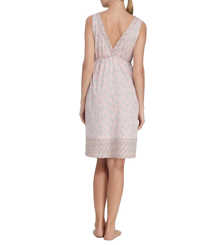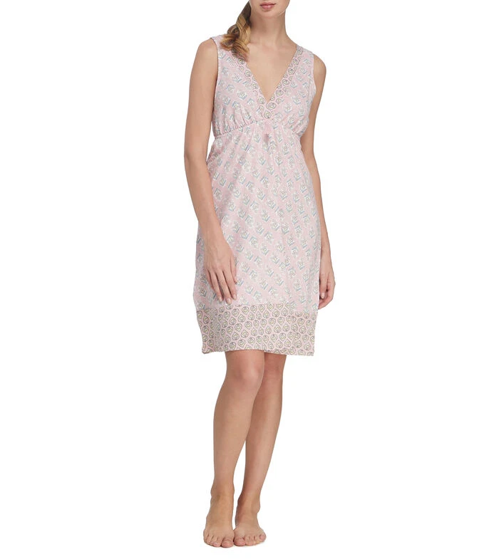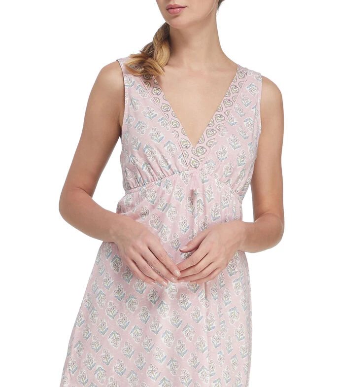 Camisón Women’Secret de corte recto en tejido de punto, cuello V, sin mangas, detalle de flequillos al frente, estampado floral y escote en espalda en V.