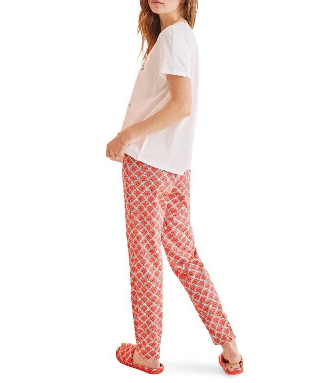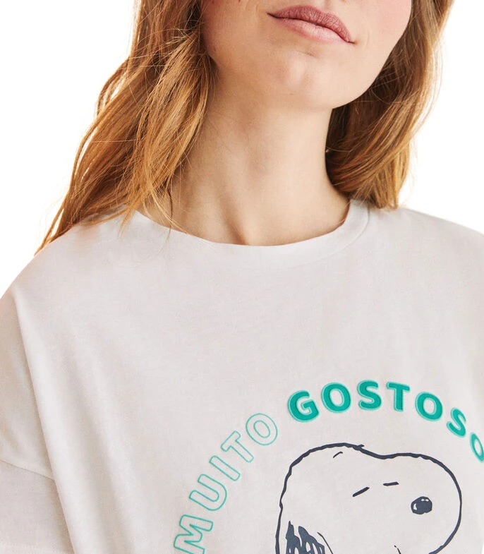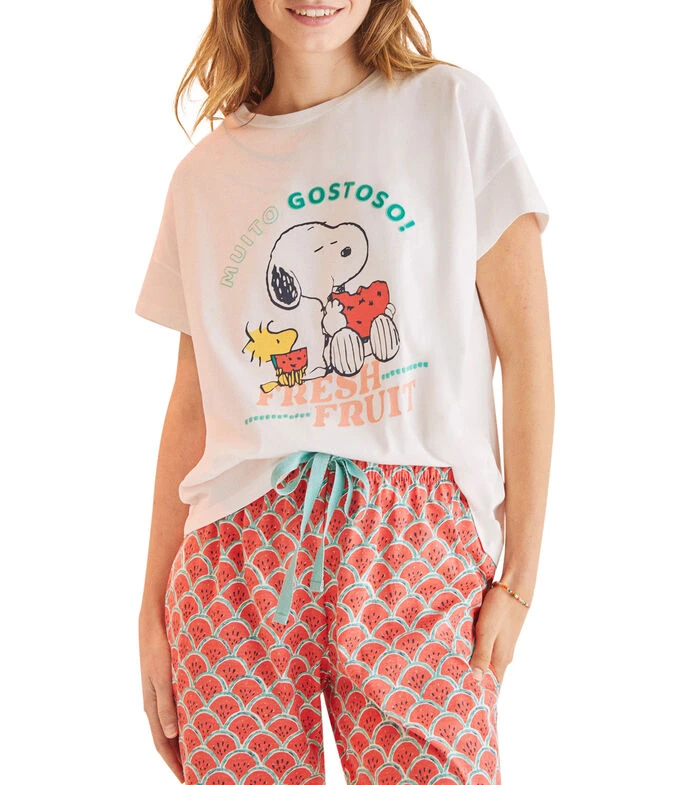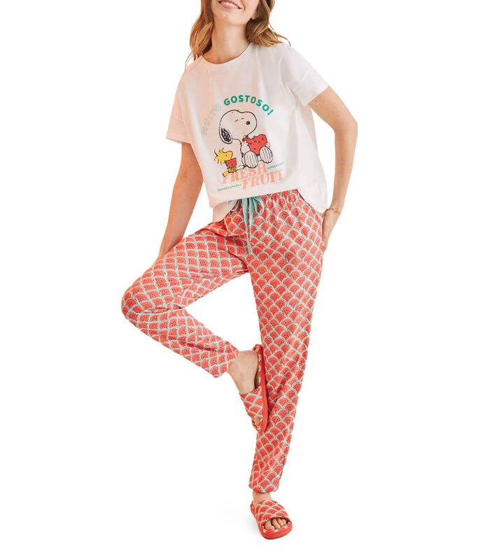 Pijama Women’Secret de 2 piezas; Playera de corte regular, estampada con el dibujo de Snoppy, cuello redondo y manga corta. Pantalón estampado con pretina elástica y cordón. Ponte cómoda en casa. Su divertido estampado es ideal para fans del famoso perrito.