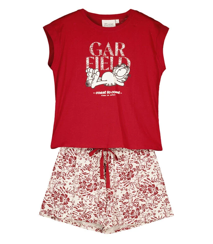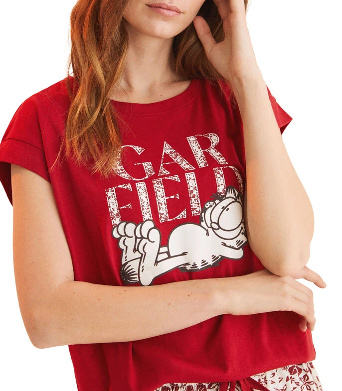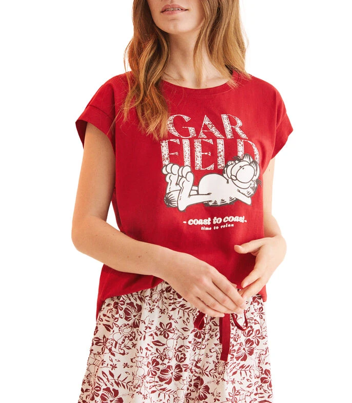 Pijama Women’Secret de dos piezas; con playera de corte recto en tejido de punto, estampado a contraste de Garfield, cuello redondo y manga corta estilo farol. Short de pretina elástica con jareta y estampado floral.