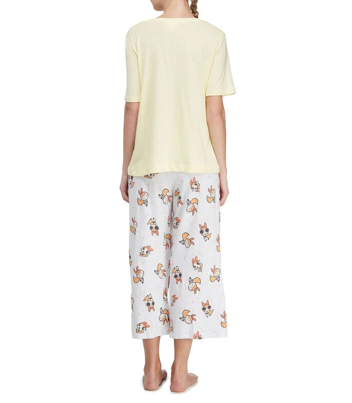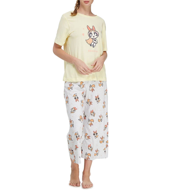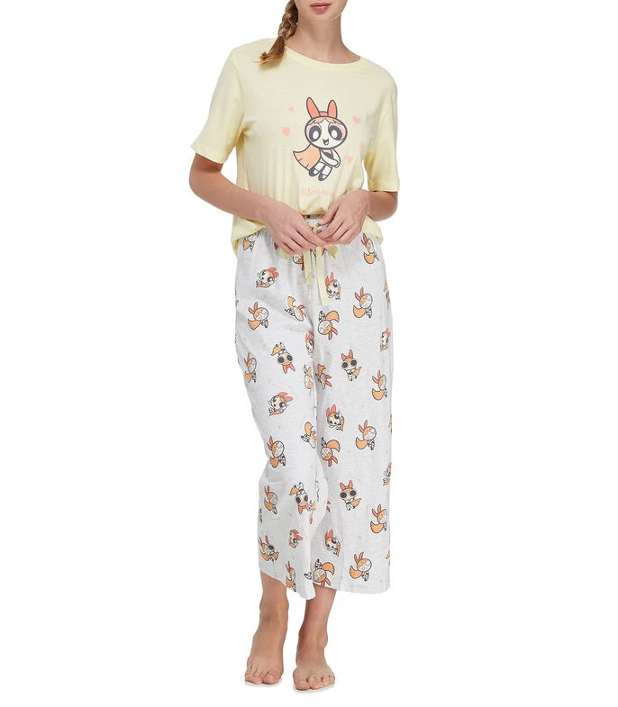 Pijama Women’Secret de 2 piezas; playera corte regular de tejido de punto con diseño alusivo a Power Puff Girls estampado, cuello redondo y manga corta. Pantalón con pretina elástica y diseño en mosaico a contraste.
