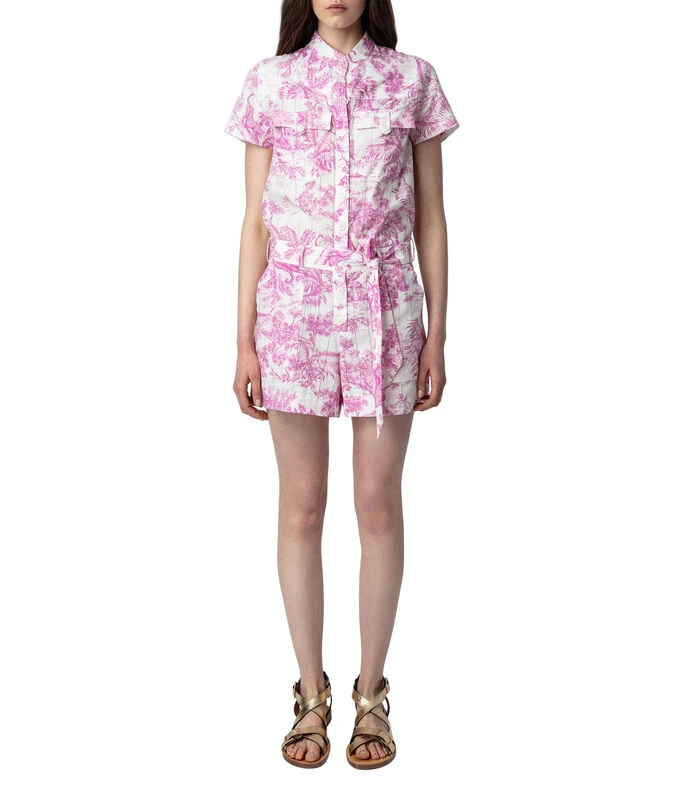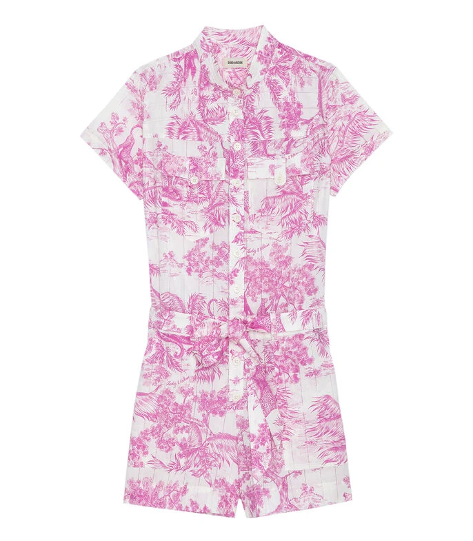 Jumpsuit Zadig & Voltaire; de corte recto en tejido de punto, estampado floral, cuello redondo, manga corta, botones frontales, bolsillos al frente y cinta decorativa.