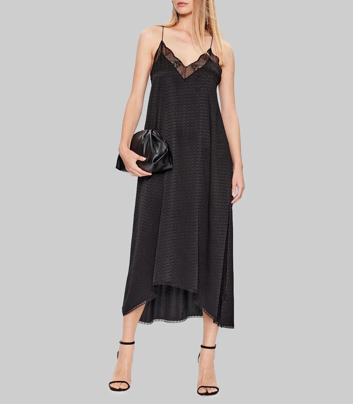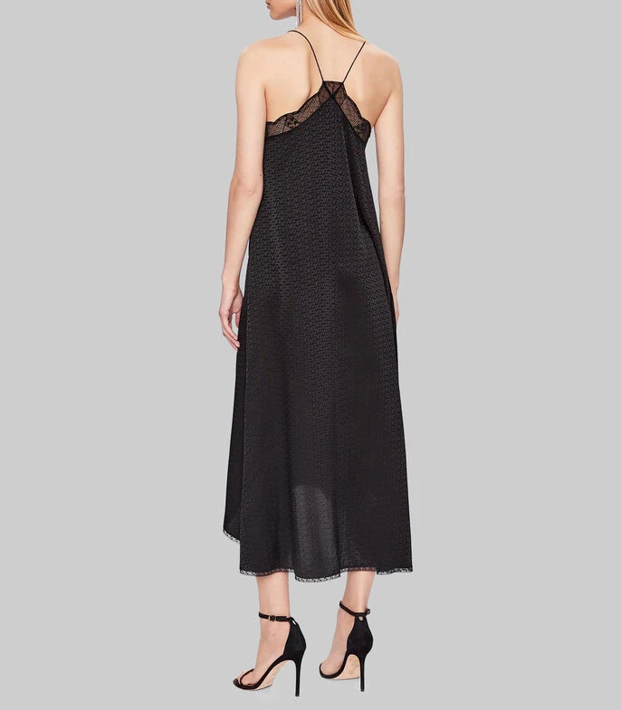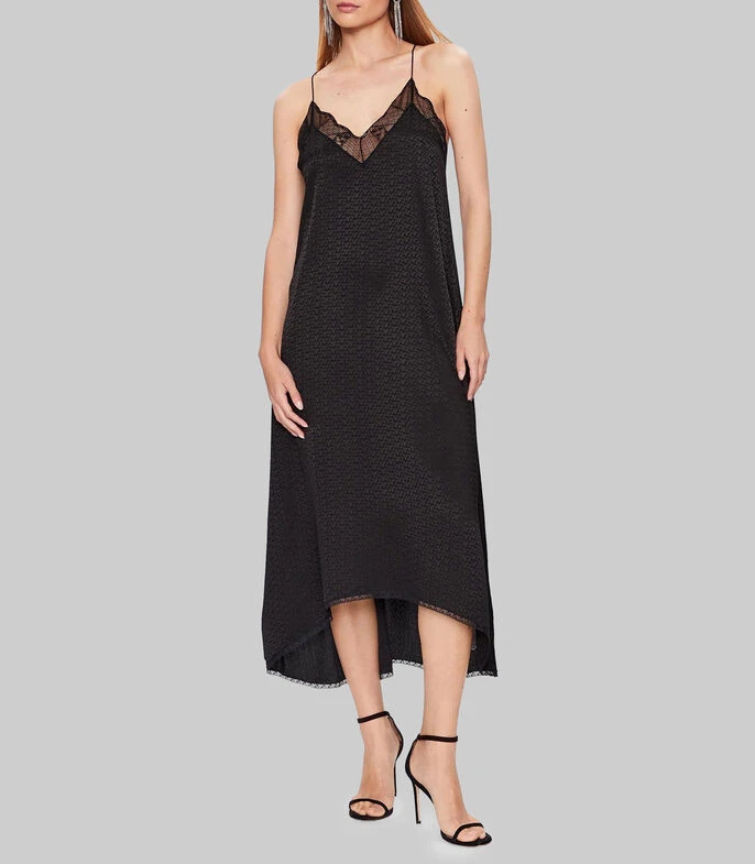 Vestido Zadig & Voltaire midi de corte recto en tejido de punto, cuello V bordes con detalle de transparencia, sin mangas, tirantes delgados y microdiseños.